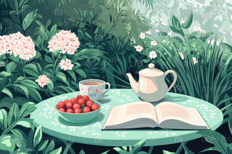 Серена садовая сцена с чаем, клубникой и открытой книгой на декоративном столе