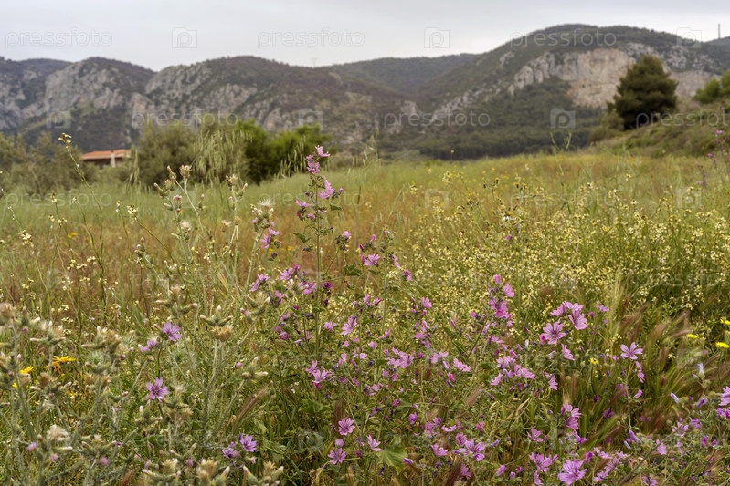 Весенний луг с горами на заднем плане