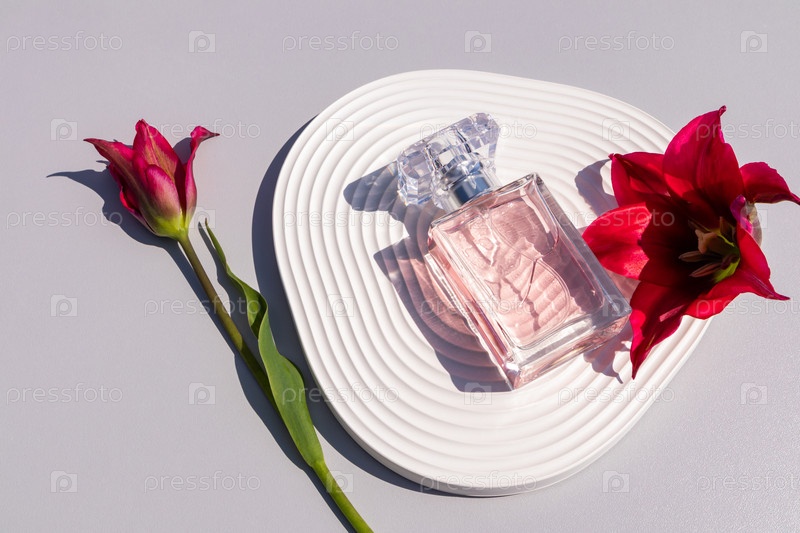 Красивая бутылка женских духов с нежным цветочным ароматом лежит на белом рельефном подиуме с весенними цветами. Вид сверху. Пустой макет бутылки