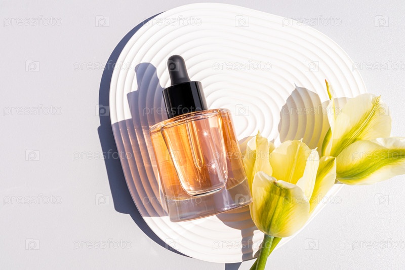 Красивая косметическая бутылка капельницы с натуральным продуктом для ухода за лицом и телом лежит на белом тисненом подносе с цветами. Вид сверху. солнечный свет