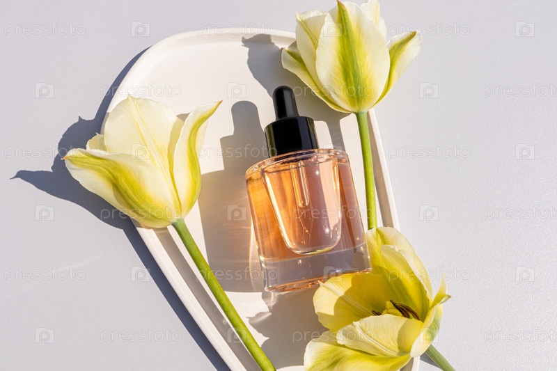 Лицевая сыворотка с витамином С или органическое масло в косметической бутылке капельницы на белом подносе с тюльпанами на солнце. Вид. дополнительная забота. Натуральная косметика