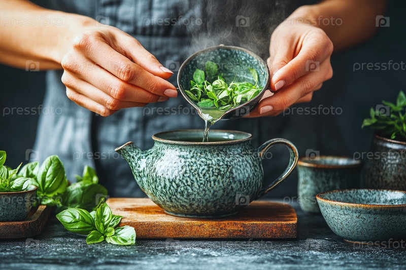 Подготовка травяного чая на деревенской кухне с натуральными текстурами и теплой атмосферой