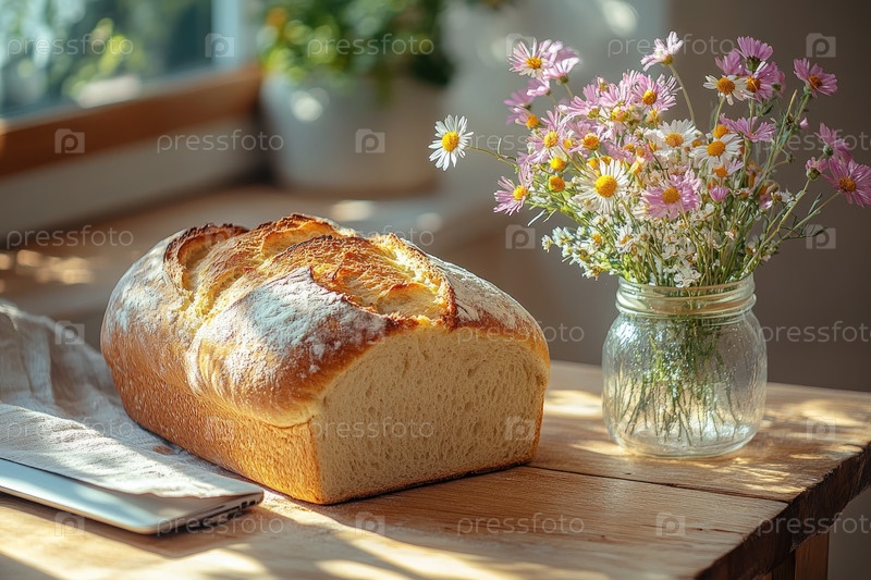 Деревянный стол со свежим хлебом, ноутбуком и полевыми цветами под теплым солнечным светом
