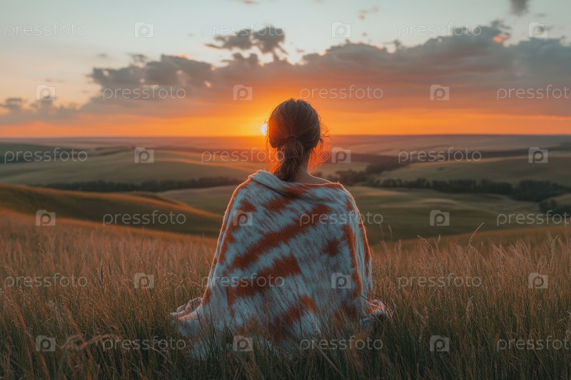 Женщина, завернутая в теплое одеяло, наслаждается спокойным закатом с тихой вершины холма
