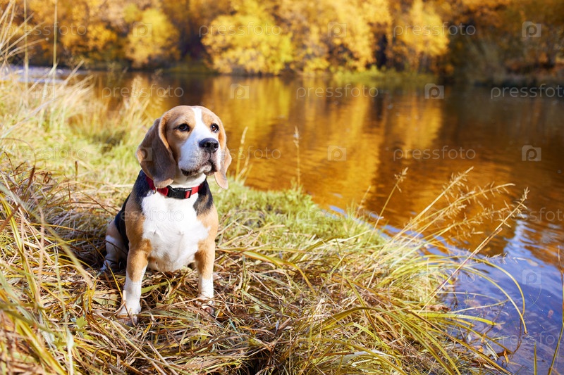 Осенний пейзаж. Бигльская собака сидит в сухой траве у реки