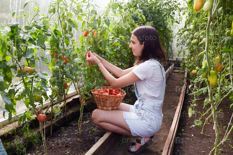 Молодая девушка собирает спелые помидоры в корзине