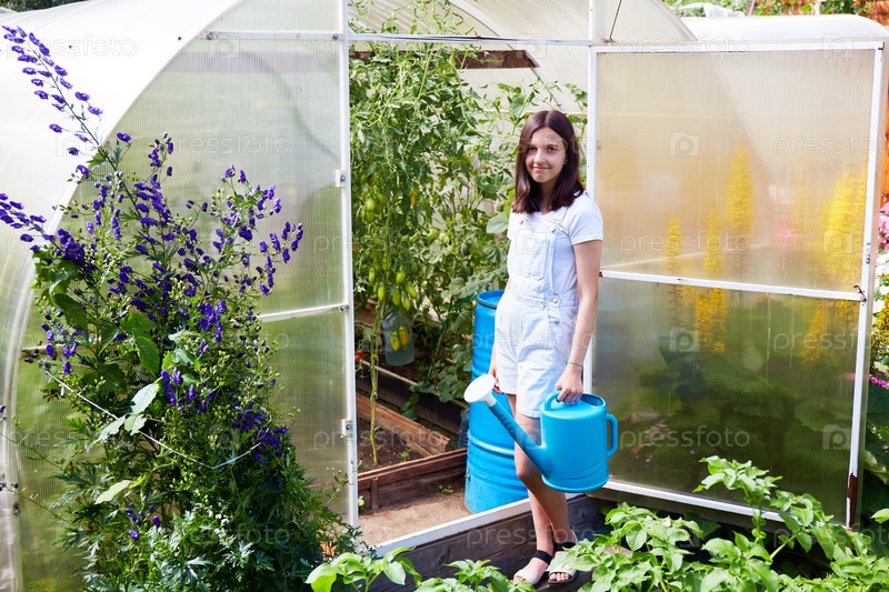 Молодая симпатичная девушка с поливочной банкой стоит у теплицы