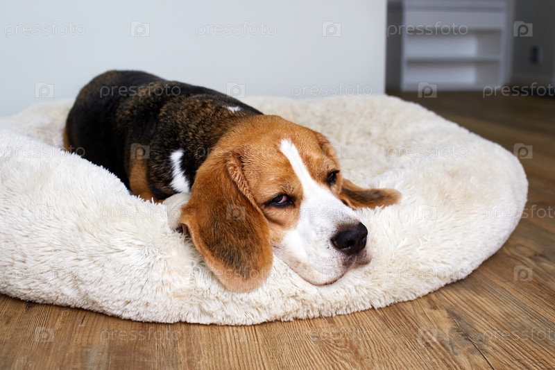Бигльская собака лежит на собачьей кровати