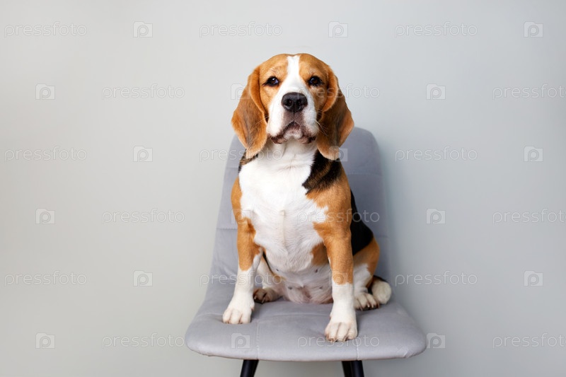 Собака-бигль сидит на сером стуле в квартире, глядя в камеру