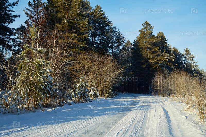 Красивая дорога через зимний заснеженный лес
