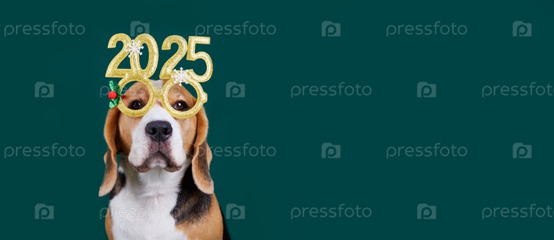 Бигльская собака в карнавальных очках с номерами 2024 года