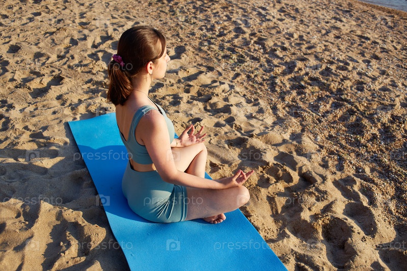 Спортивная девушка, сидящая на песчаном пляже с положением лотоса йоги