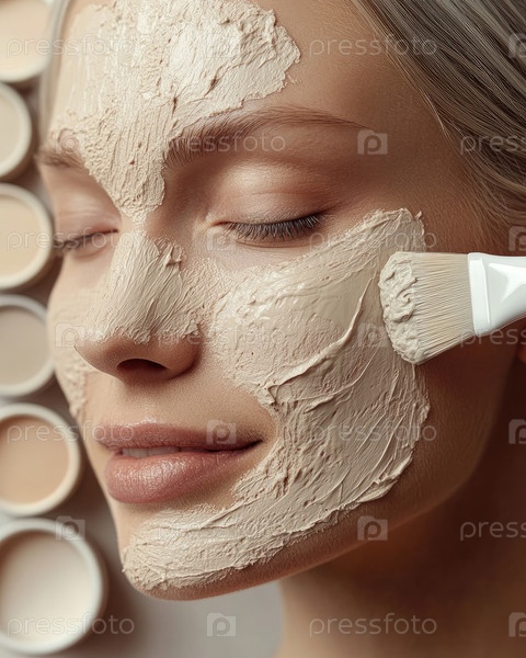 Женщина наносит маску для лица кистью, окруженная банками средств по уходу за кожей, подчеркивая рутину красоты и самообслуживания в спокойной и привлекательной атмосфере