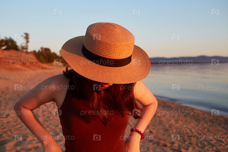 Девушка в соломенной шляпе гуляет на закате на песчаном пляже. Летние путешествия, морские каникулы