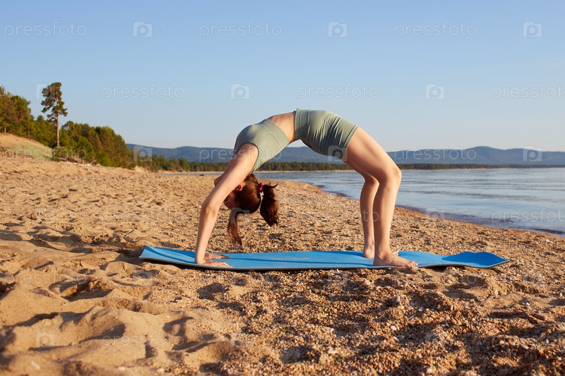 Молодая спортивная девушка занимается йогой на песчаном пляже, стоя в позе моста