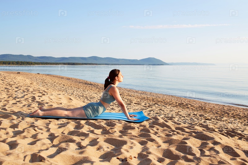 Спортивная девушка практикует йогу на песчаном пляже. Упражнения на растяжку и расслабление