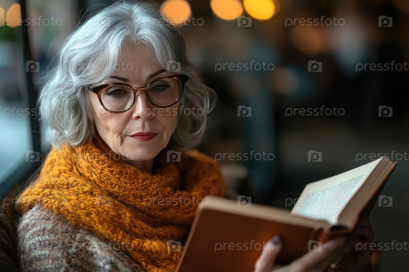 Пожилая женщина с седыми волосами глубоко занимается чтением книги в помещении, завернутой в уютный оранжевый шарф, окруженная теплой и приглашающей атмосферой с мягким освещением и размытым фоном