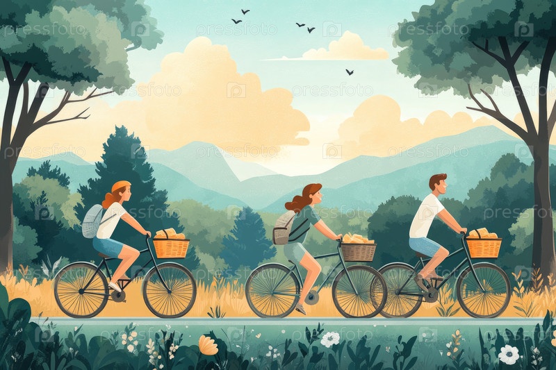 Три велосипедиста наслаждаются неспешной прогулкой на велосипедах по живописному ландшафту, окруженному пышными деревьями и далекими горами, захватывая суть приключений на свежем воздухе и свободы