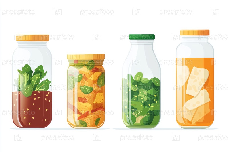Красочные банки, наполненные свежими овощами и зеленью, демонстрирующие здоровый приготовление пищи, аккуратно устроенные на белом фоне, подчеркивающие яркие цвета и питательные ингредиенты