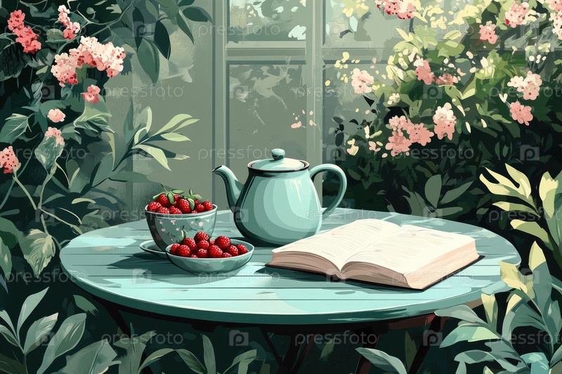 Чайник, наполненный чаем, сидит рядом с чашей свежей клубники и открытой книгой на круглом садовом столе, окруженном пышной зеленью и красочными цветами, создающими безмятежную атмосферу