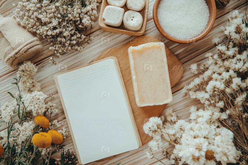 Натуральный спа-центр с пустым ноутбуком, мылом и декоративными цветами для отдыха и хорошего самочувствия