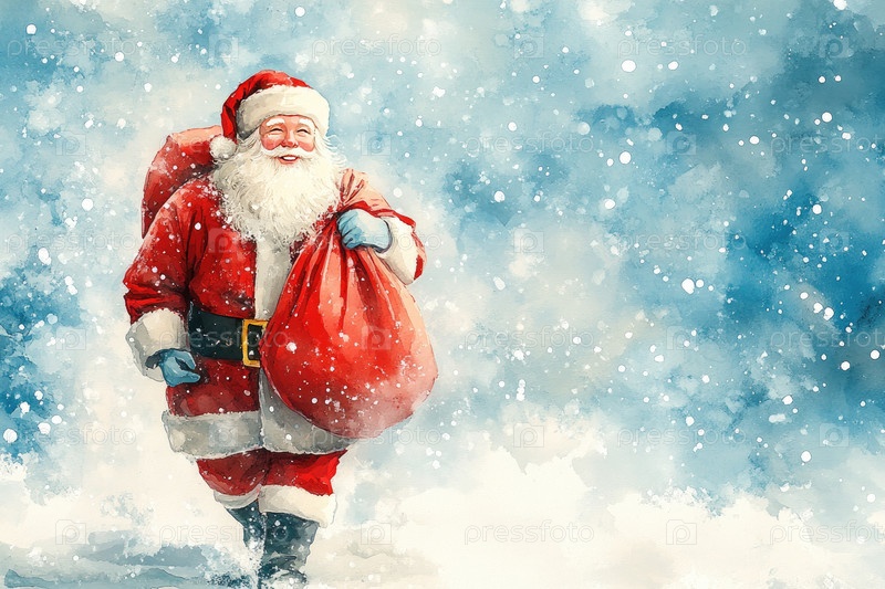 Веселый Санта Иллюстрация Клауса с красным мешком во время прогулки по снежному ландшафту