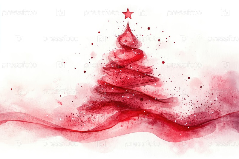 Акварельная иллюстрация яркой красной рождественской елки со звездными и праздничными украшениями