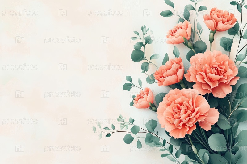 Красивая цветочная композиция с мягкими розовыми гвоздиками и зелеными листьями эвкалипта с копирайтом
