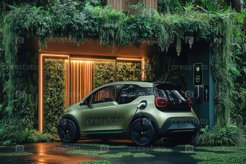 Электромобиль припаркован в современном гараже в окружении пышной зелени и окружающего освещения