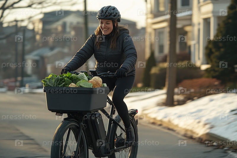 Женщина катается на велосипеде со свежими овощами в корзине, наслаждаясь уличной активностью в городских условиях
