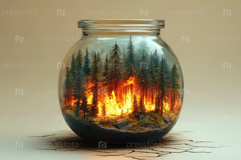 Стеклянная банка, содержащая миниатюрную лесную сцену с пламенем и дымом, изображающую экологический кризис
