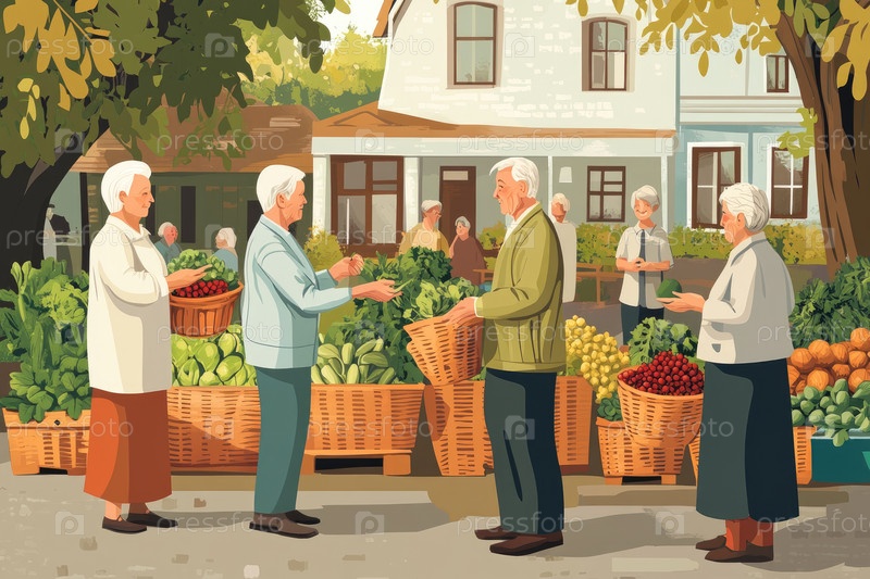 Пожилые люди, участвующие в дружеской беседе на оживленной уличной фермерской арене