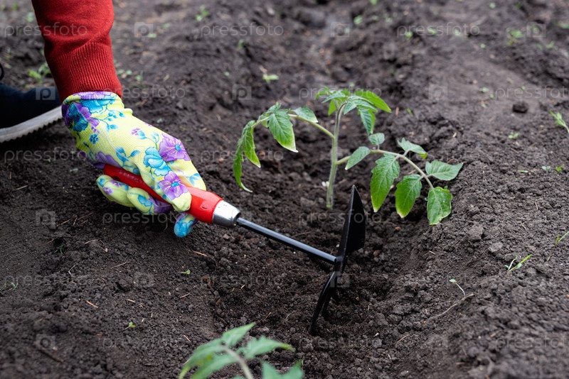Садовник, ухаживающий за молодыми томатными растениями в домашнем саду весной