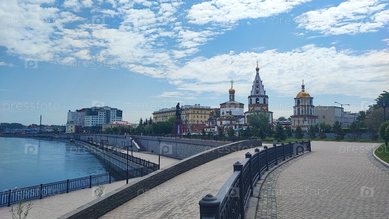 Летний день на набережной в городе Иркутске, вид на реку Ангару и собор Богоявления.Летний день на набережной в Иркутске, вид на реку Ангару и кафедральный собор Епифании