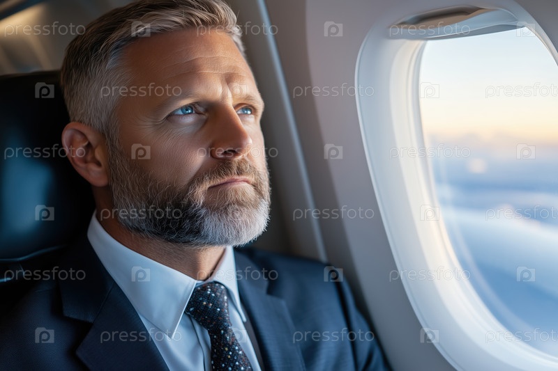 Зрелый мужчина в деловом костюме летит в самолете рядом с окном