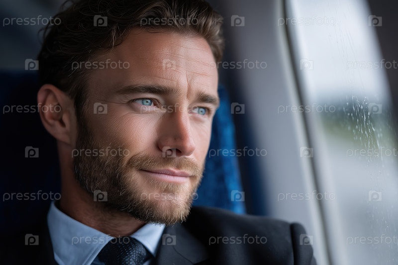 Красивый молодой человек смотрит в окно пассажирского самолета перед взлетом или после посадки