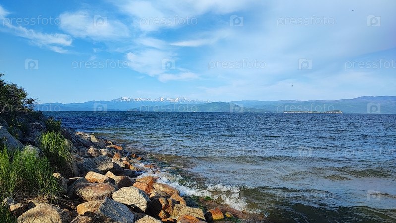 Пейзаж, каменистый берег озера Байкал на полуострове Святой Нос, Баргузин