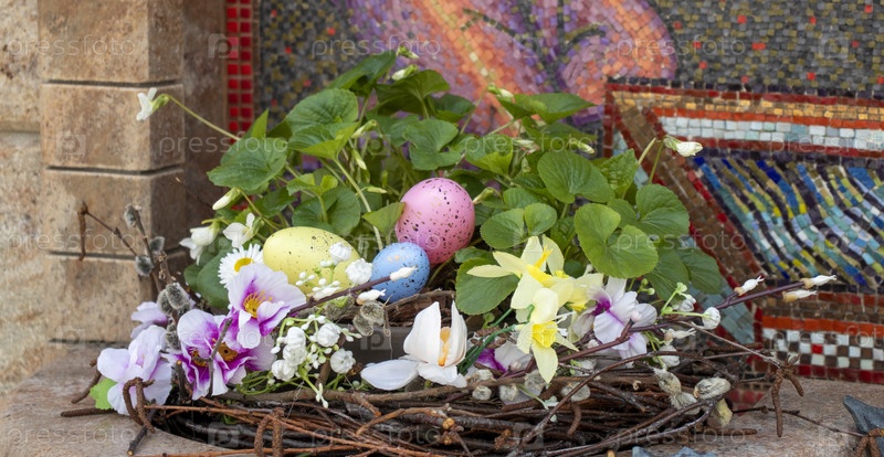 Пасхальные украшения с цветными яйцами и другими элементами. Религия