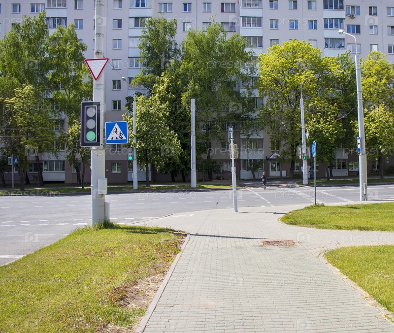 Вид светофора на пешеходном переходе. Город