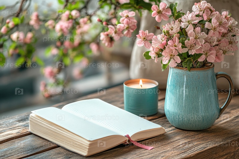 Открытая тетрадь с розовыми цветами в вазе и свечами на деревенском деревянном столе в уютной обстановке