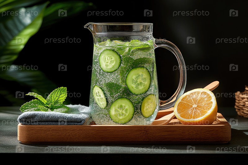 Освежающий кувшин для напитков, заполненный ломтиками огурцов, листьями мяты и лимоном на деревянном подносе