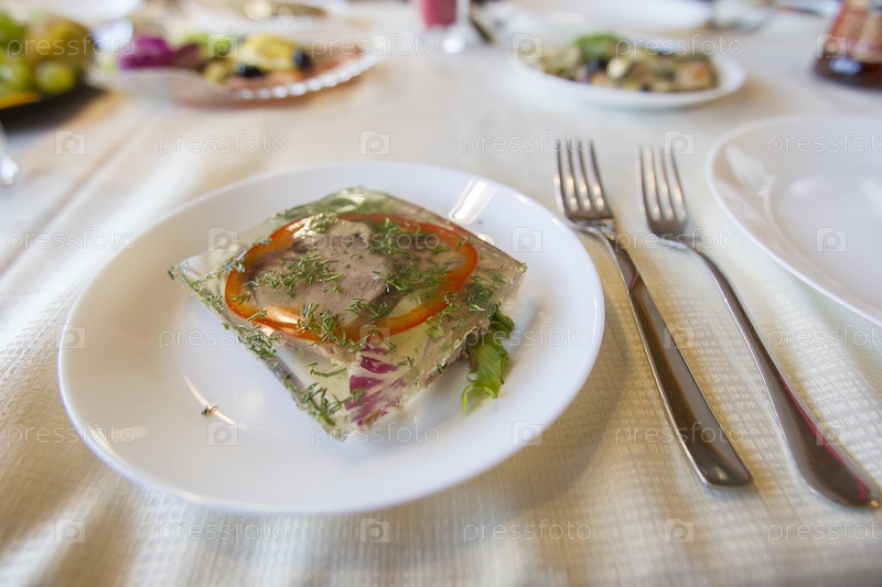 Заливное мясо на тарелке. Говяжье желе