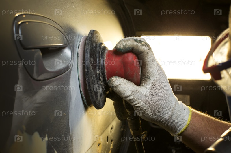 Руки шлифуют или полируют машину. Ремонт кузова автомобиля