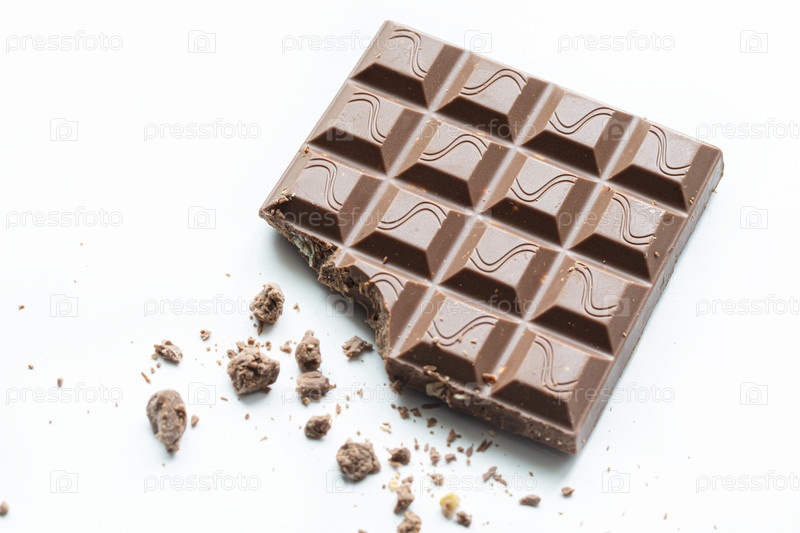Сломанный кусок шоколада с крошками на белом фоне. Десерт какао