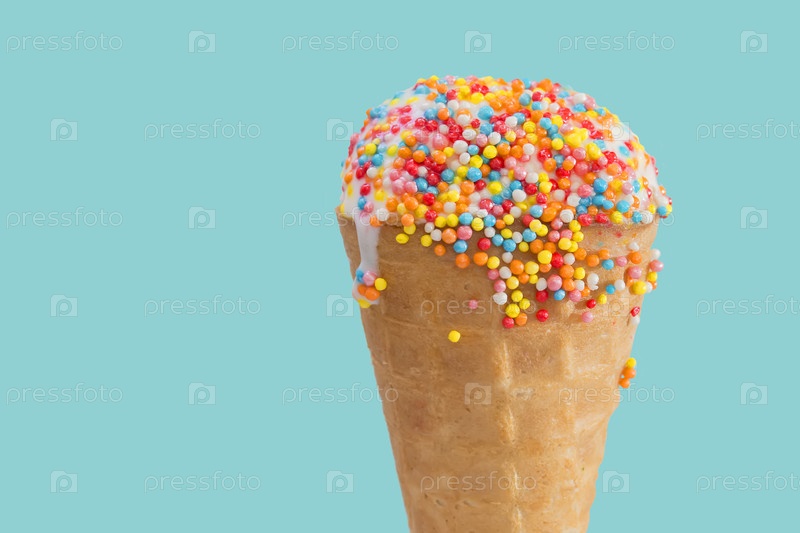 Конус мороженого закрывается. мороженое в вафельном конусе на синем фоне. Сладкий десерт, украшенный разноцветными посыпками