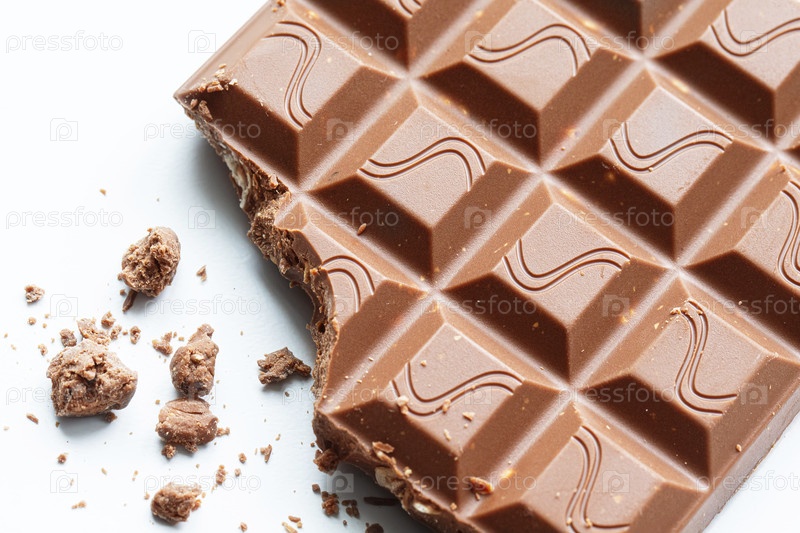Сломанный кусок шоколада с крошками на белом фоне. Десерт какао