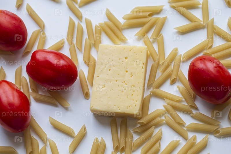 Помидоры кусок сырной пасты на белом фоне крупным планом
