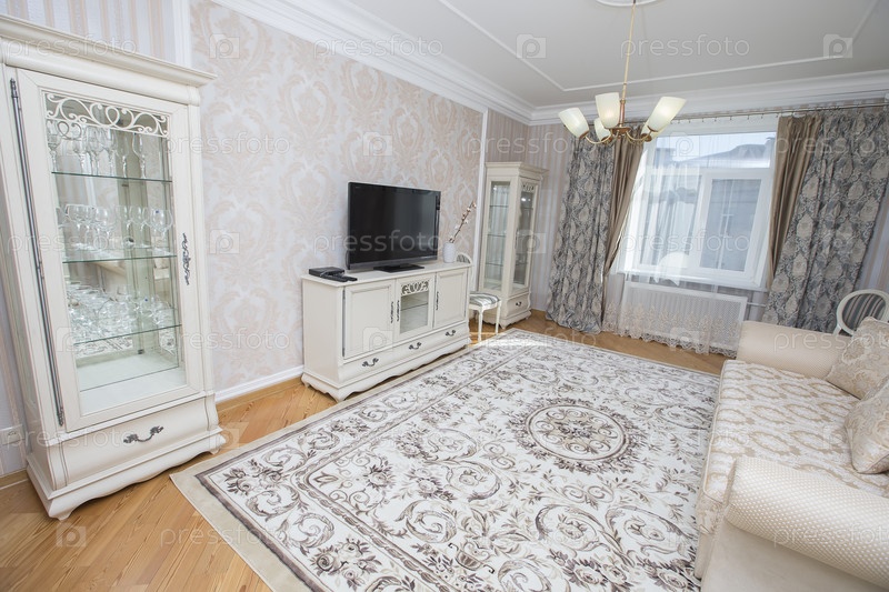 Квартира в панельном доме. Интерьер светлой гостиной в классическом стиле с окном