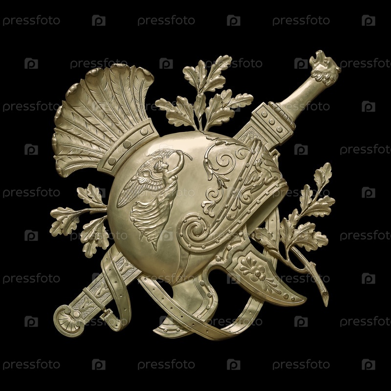 Золотой декоративный элемент интерьера с изображением шлема из древнегреческого мифа. Элемент изолирован на черном фоне