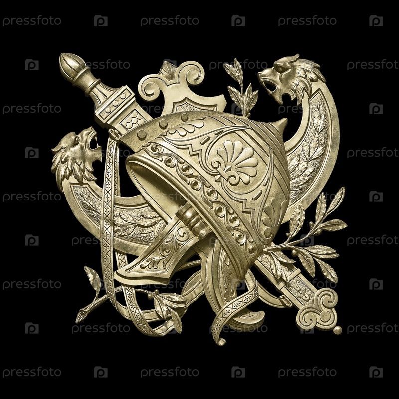 Золотой декоративный элемент интерьера с изображением шлема из древнегреческого мифа. Элемент изолирован на черном фоне